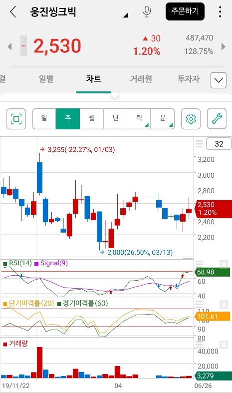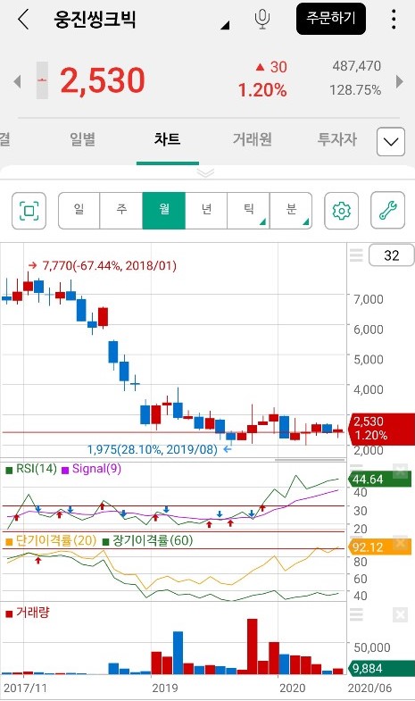 웅진씽크빅의 현재(2020.06.28.) 주가는 2,530원입니다. 주가는 전체적으로 하락세입니다.