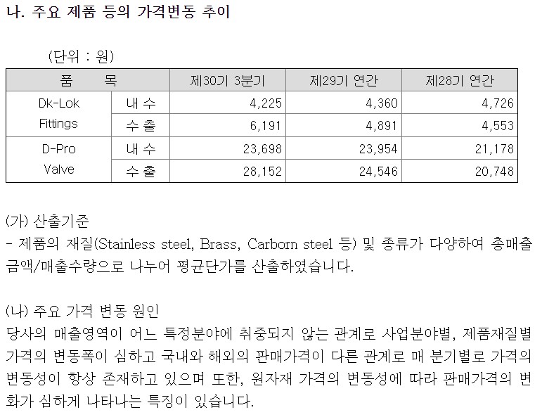 지난 3년간 주요 제품의 가격 변동 추이는 ‘Dk-Lok Fittings’는 내수는 하락추세, 수출은 상승추세이며 ‘D-Pro Valve’는 내수는 상승과 하락을 반복, 수출은 상승추세입니다.