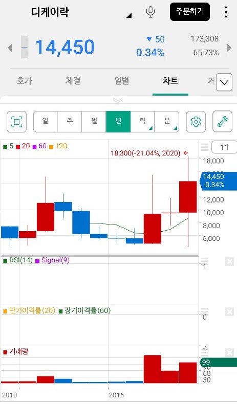 디케이락의 현재(2020.12.20.) 주가는 14,450원입니다. 주가는 18년부터 지속 상승헸으며 20년 급등했습니다.