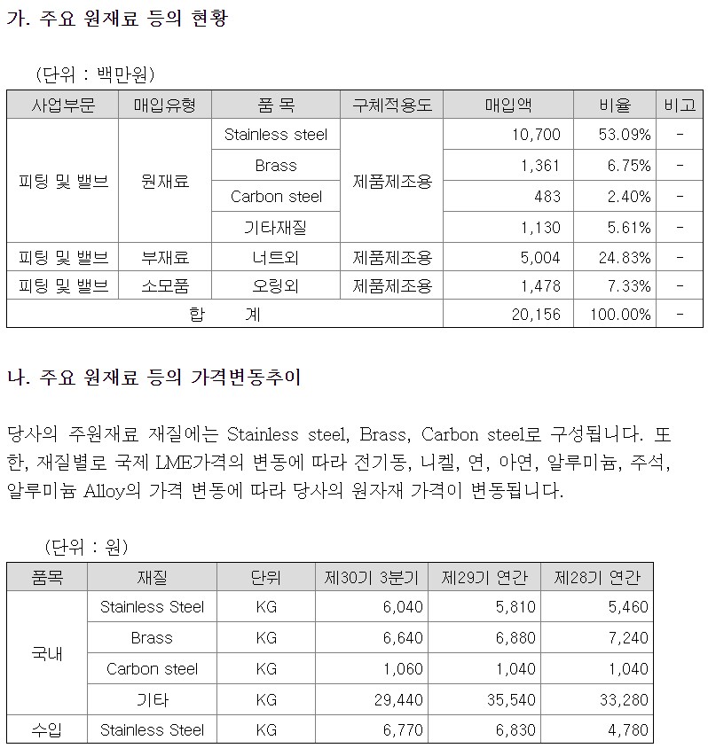 2020년 3분기 매출액 기준 사업 부문별 매출은, Fitting 50%(수출 66%, 내수 34%), Valve 31%(수출 68%, 내수 32%), 상품 13%(수출 89%, 내수 11%) 순으로 비중을 차지하고 있습니다.