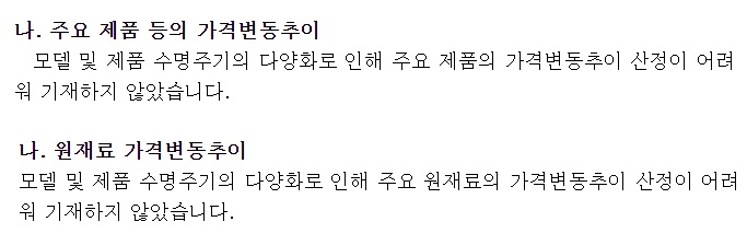 모델 및 제품 수명주기가 다양하여 제품 가격 및 원재료의 가격 변동은 기재하지 않았습니다.
