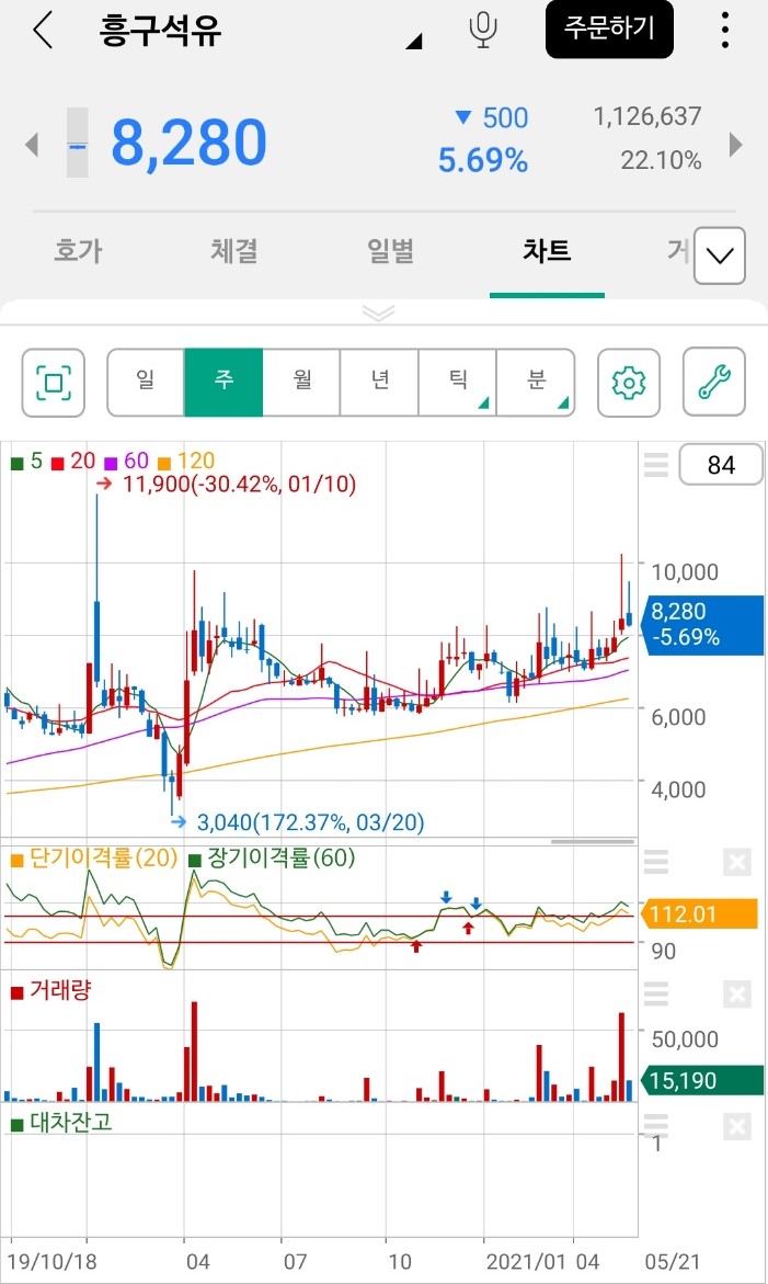 흥구석유의 현재(2021.05.20.) 주가는 8,280원입니다. 주가는 19년~21년 급등했습니다.