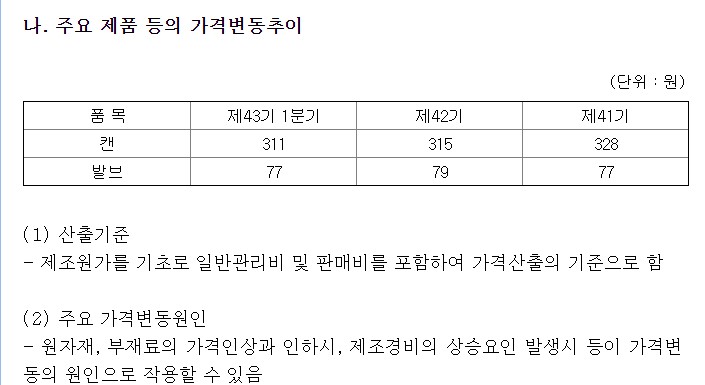 주요 제품의 가격은 ’캔‘의 경우 지난 3년간 지속 하락세, ’발브‘의 경우 상승과 하락을 반복하고 있습니다.
