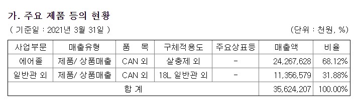 2021년 1분기 매출액 기준, 에어졸 부문 68%, 일반관 부문 31%로 비중을 차지하고 있습니다.