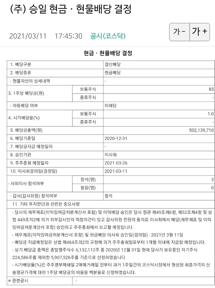 1. 승일 배당금 및 배당일