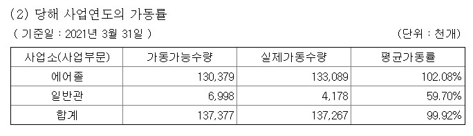 21년 1분기 기준 사업장 가동률은 에어졸 102%, 일반관 59%이며 합계 평균은 99%입니다.
