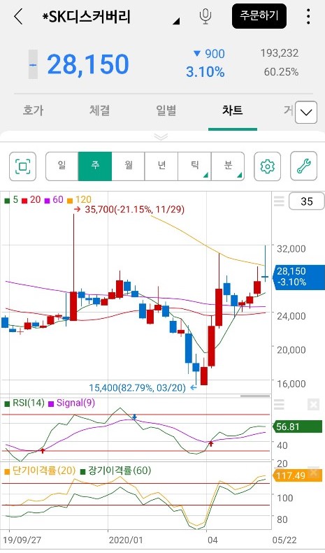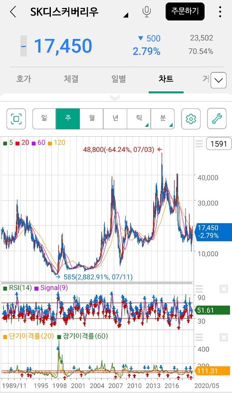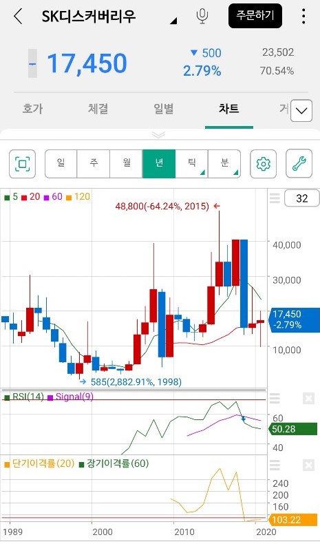 sk디스커버리의 현재(2020.05.24.) 주가는 28,150원이며 sk디스커버리우는 17,450원입니다. 17년까지는 sk케미칼의 주가이며, 17년 이후가 sk디스커버리의 주가입니다.