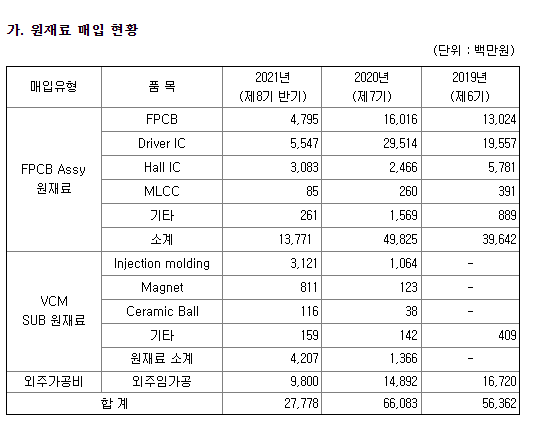 원재료 가격 변화도 품목별로 제시하고 있으며, 원재료 매입액에서 가장 큰 비중(19%)을 차지하는 'Driver Ic'의 가격은 20년 대비 21년 반기 상승, 그 다음 비중(17%)을 차지하는 'FPCB'의 가격은 하락했습니다.