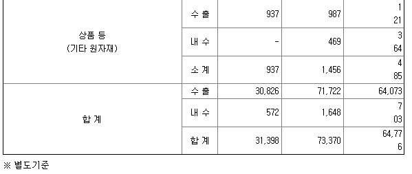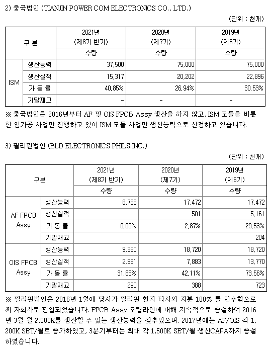 21년 반기 기준 매출 비중은 OIS FPCB Assy 63%, SUB Assy 26%, ISM 5%, AF FPCB Assy 2%이며 별도 기준 매출에 대한 수출과 내수 비중은 수출 98%, 내수 2%로 수출 비중이 높습니다.