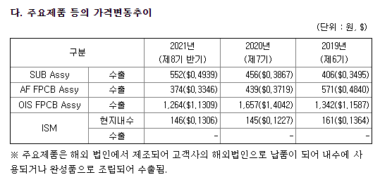 제품 가격은 주요 품목 4개에 대해 제시하고 있으며, 2개 품목(OIS, AF)은 20년 대비 21년 반기 가격 하락, 2개 품목(ISM, SUB)은 가격이 상승했습니다.