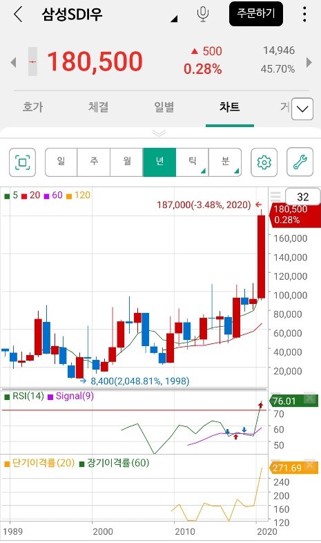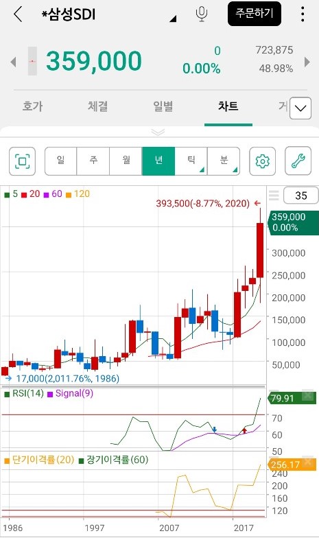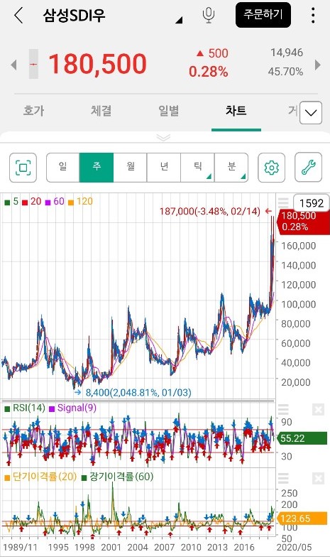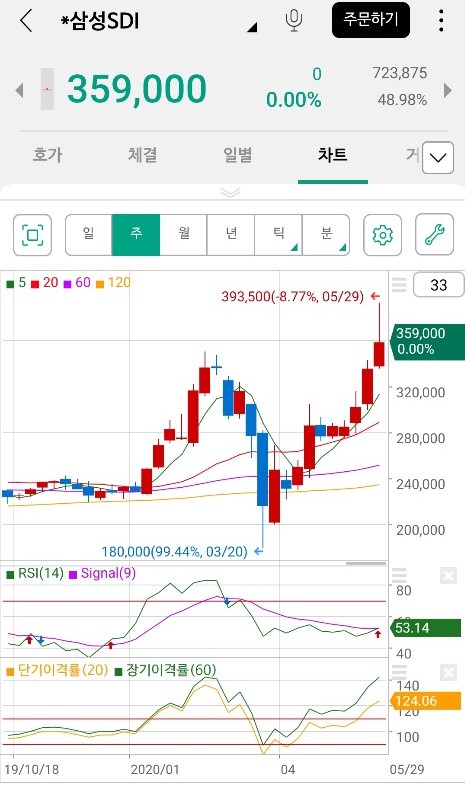 삼성sdi의 현재(2020.05.30.) 주가는 359,000원이며 삼성sdi우는 180,500원 입니다. 주가는 전체적으로 우상향입니다.