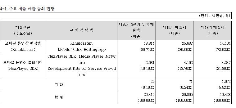 모바일 동영상 편집앱 사업 부문에서는 모바일 동영상 편집앱인 '키네마스터'를 제공하고 있으며, 키네마스터는 2021년 9월말 기준 누적 5억이상의 다운로드를 돌파하고 국내 뿐만 아니라 약 155개 국가에서 18개의 언어로 서비스가 제공되고 있습니다.