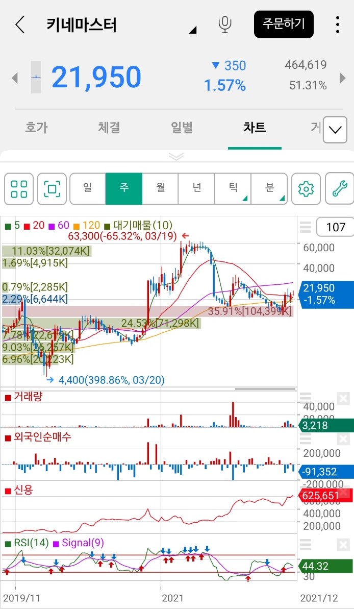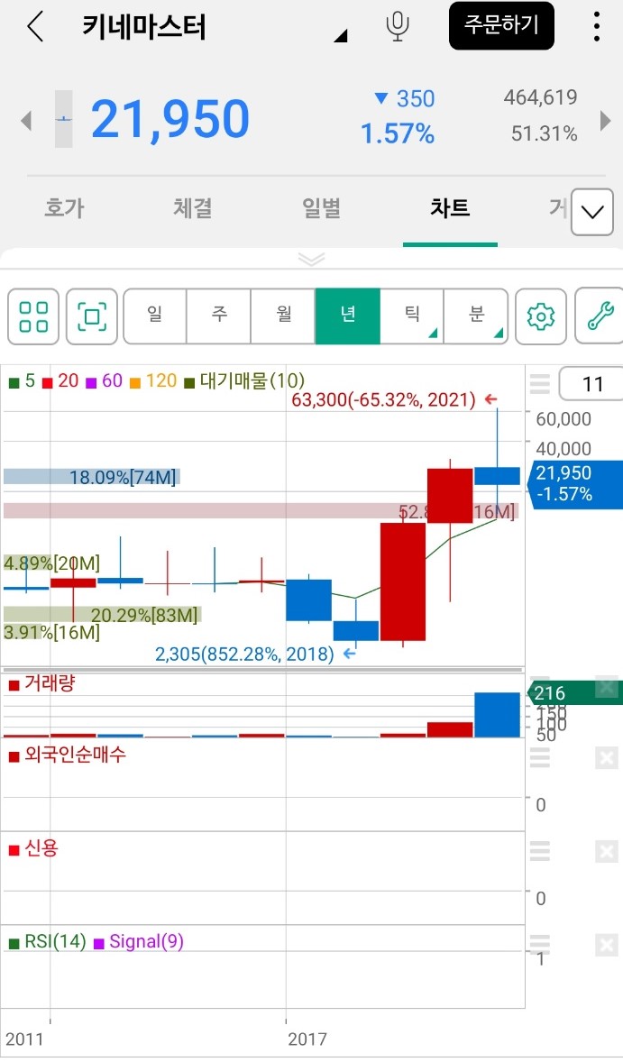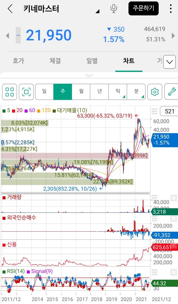 상장 이후 키네마스터의 주별, 월별, 연별 주가 및 주가 추이는 다음과 같습니다.