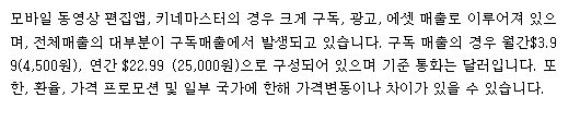 당사의 매출에서 높은 비중을 차지하는 '키네마스터'의 수익원은 크게 구독, 광고, 에셋 매출이며, 대부분이 구독 매출을 통해 발생합니다. 구독가격은 월간$3.99(4,500원), 연간 $22.99 (25,000원)으로 구성되어 있습니다.