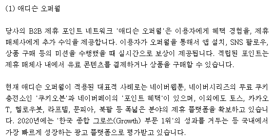 애디슨 오퍼월은 B2B 제휴 포인트 네트워크로, 이용자가 오퍼월을 통해서 앱 설치, SNS 팔로우, 상품 구매 등의 미션을 수행했을 때 실시간으로 보상이 제공하며, 대표적인 사례로는 '네이버웹툰의 쿠키 오븐'이 있습니다.