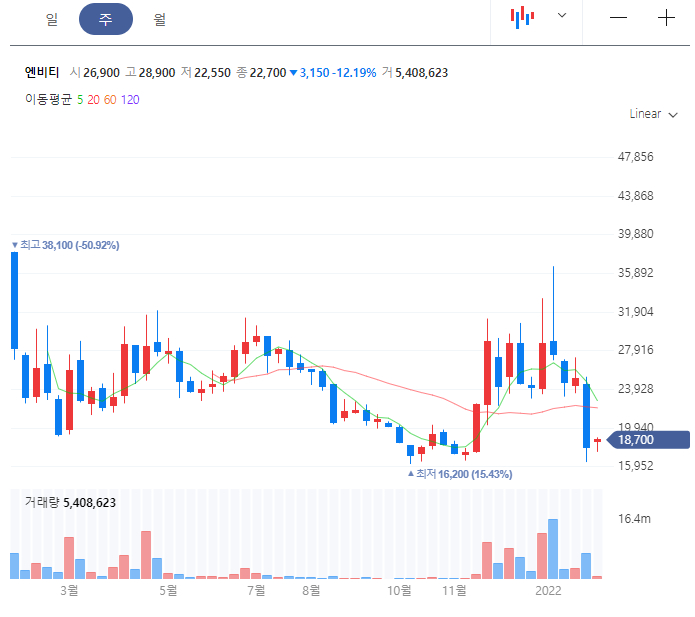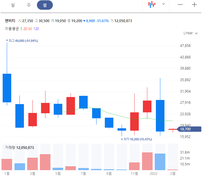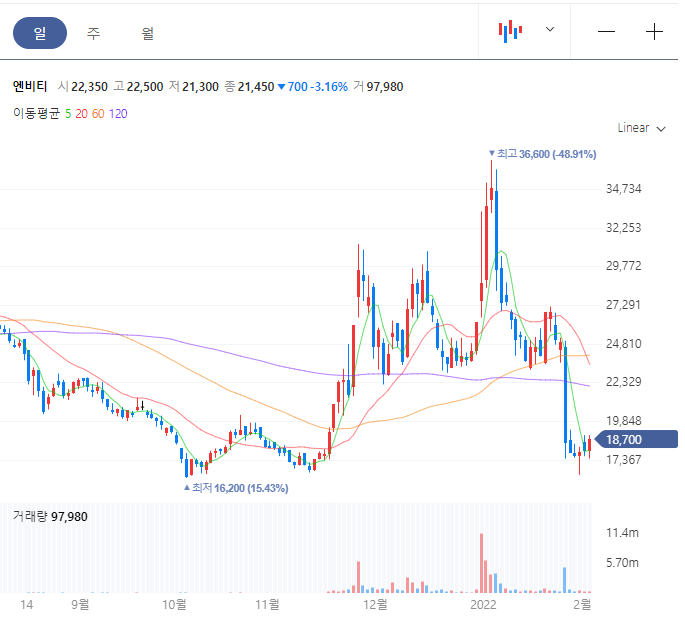 엔비티의 현재(22.02.06.) 주가는 18,700원이며, 주가는 21년~22년 10차례 급등했습니다.