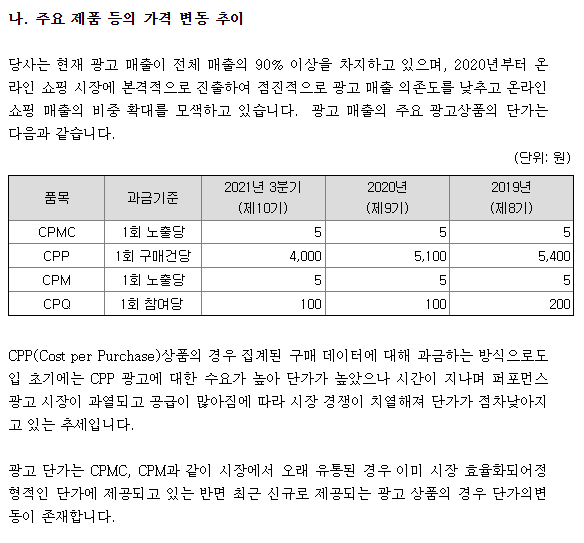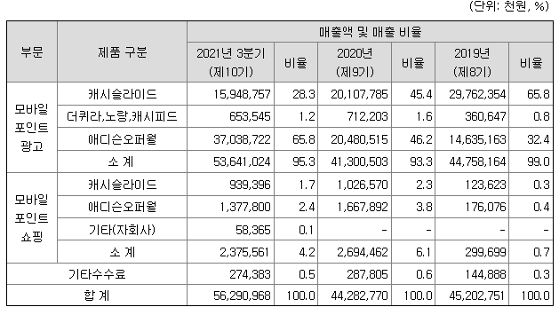 21년 3분기 기준 당사의 매출 비중은 모바일 포인트 광고 95%(애디슨 오퍼월 65%, 캐시슬라이드 28%, 더퀴라/노랑/캐시피드 1%), 모바일 포인트 쇼핑 4% 입니다.