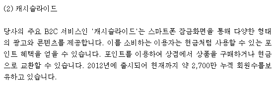 캐시슬라이드는 당사의 주요 B2C 서비스로, 스마트폰 잠금화면을 통해 다양한 형태의 광고와 콘텐츠를 제공합니다. 2012년 출시된 캐시슬라이드는 현재까지 약 2,700만 누적 회원수를 보유하고 있습니다.