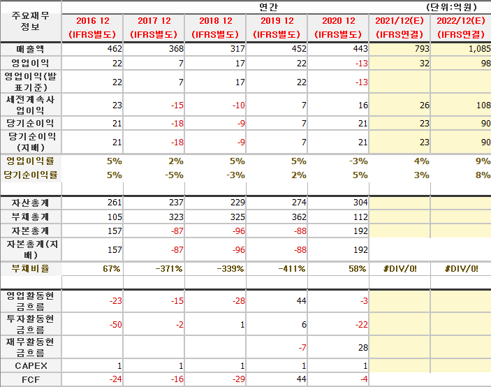 다음은 엔비티의 최근 5년간 주요 재무 정보를 요약한 내용입니다.(21년~22년까지는 예측값입니다.)